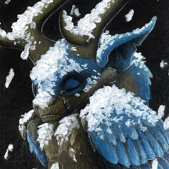 Ce dessin est une création originale illustrant un petit dragonnet dormant sous la neige d'hivers.